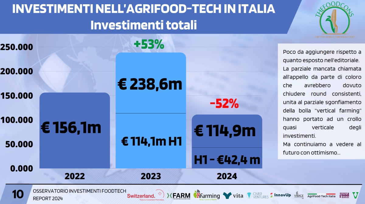 Va considerata poi una cosa. Il 2023 è stato un anno di forti investimenti a debito, soprattutto sul fronte delle vertical farm. Se infatti scorporiamo il debito e guardiamo sostanzialmente all'equity, risulta che il 2024 ha totalizzato 113 milioni, il 2023 143 milioni e il 2022 ben 156 milioni.