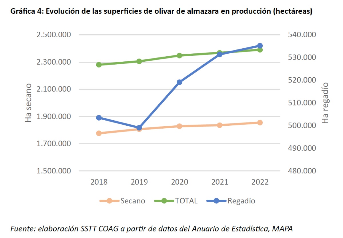Questa intensificazione ha favorito un'espansione delle superfici coltivate. Secondo i dati del Ministerio de Agricultura, Pesca y Alimentación (Mapa), tra il 2018 e il 2022 le superfici irrigue a olivo sono aumentate del 6,3%, rispetto al +4,4% degli oliveti in asciutto. Un trend che evidenzia quanto l'accesso all'acqua sia ormai un fattore discriminante per la redditività aziendale.