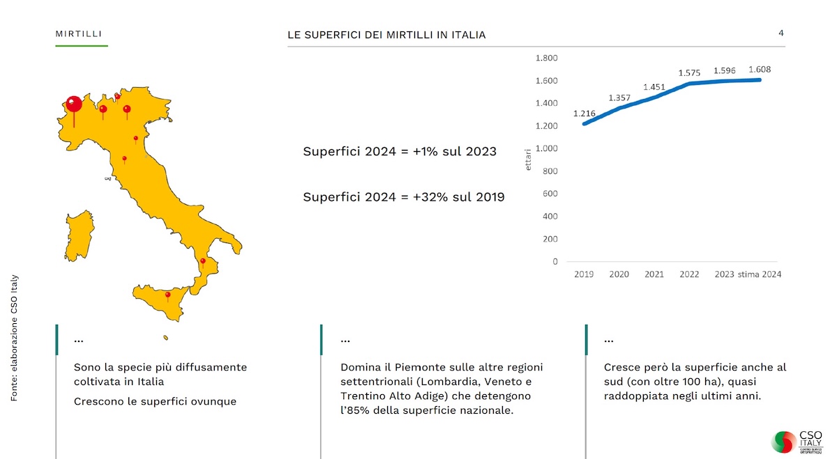 Proprio al Cso Italy è stato affidato il compito di inquadrare i numeri del comparto, aggiornandoli. Il Centro Servizi ha anche lanciato per la prima volta il progetto triennale "Berry Swing" che vuole promuovere proprio il consumo dei piccoli frutti in Italia e in Germania, in particolare fra i giovani. Guardando alle aree di produzione, la fotografia scattata dal Cso Italy mostra una superficie di 2.509 ettari in Italia (-1% sul 2023). Il Piemonte continua ad essere leader indiscusso con 780 ettari, ma gli areali si sono allargati anche al Sud (250 ettari fra Sicilia, Campania e Calabria). Si stimano 1.608 ettari a mirtillo nel 2024 (+1% sul 2023 e +32% sul 2019).