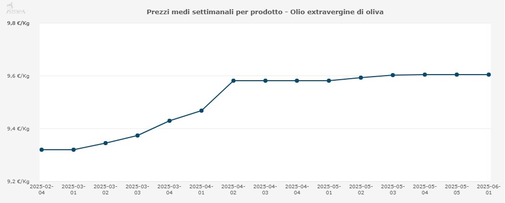 La crescita lungo la campagna di commercializzazione si apprezza di più guardando al prezzo medio dell'olio Evo rilevato da Ismea nella seconda settimana di novembre 2024 e pari a 8,50 euro al chilo: da allora alla prima settimana di giugno 2025 la crescita del prezzo è stata pari a 1,10 euro al chilogrammo.