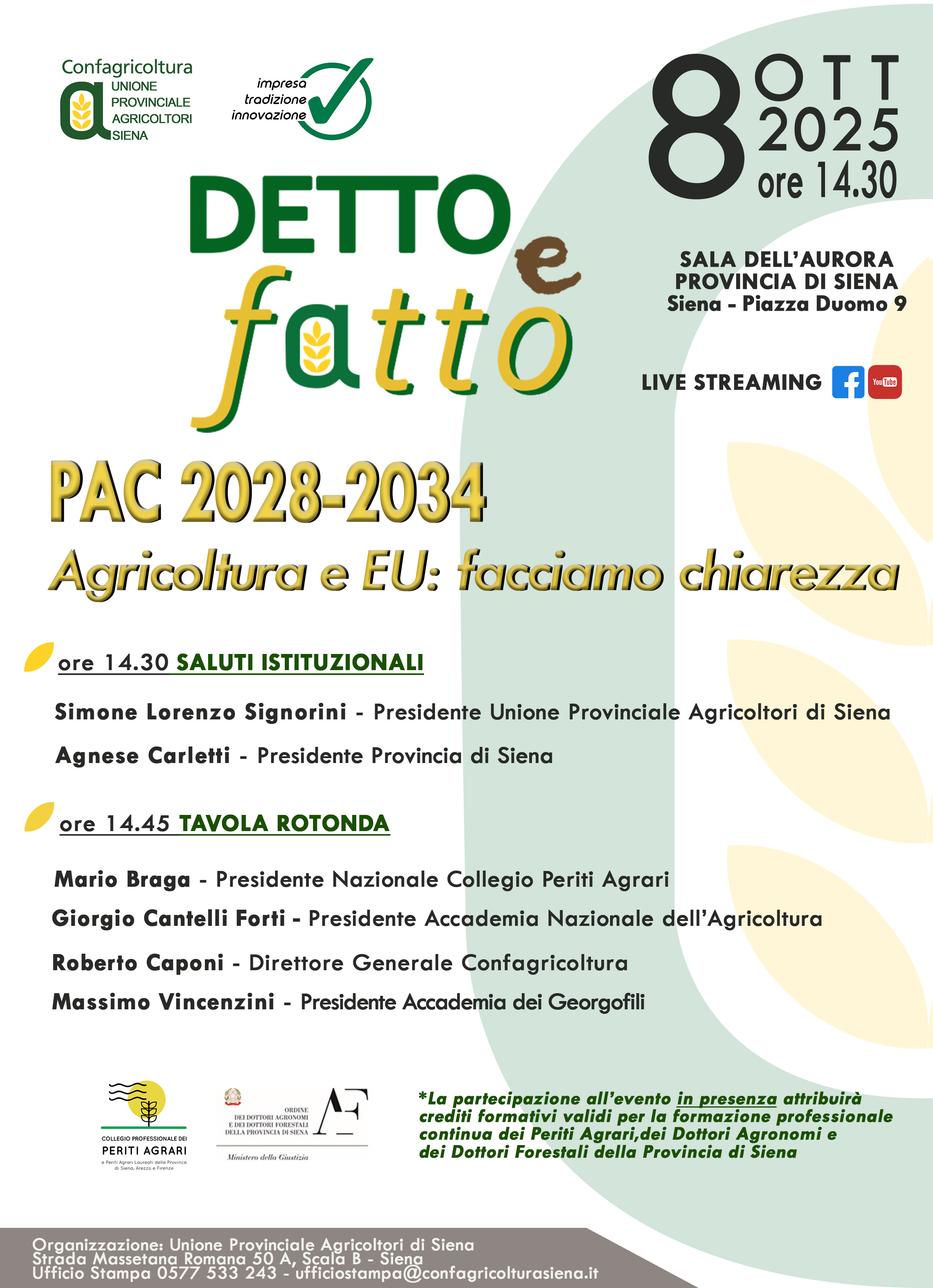 Mercoledì 8 ottobre 2025 alle 14:30 l'Unione Provinciale Agricoltori di Siena promuove l'incontro "Pac 2028-2034, agricoltura e Eu: facciamo chiarezza" nella Sala dell'Aurora in Provincia di Siena. L'evento sarà trasmesso anche in diretta streaming sulla pagina Facebook e sul canale YouTube di Confagricoltura Siena.