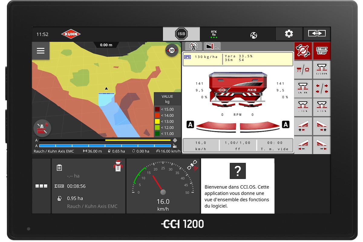 Per la gestione degli spandiconcime Isobus, KUHN propone in opzione i terminali touchscreen a colori CCI 800 o 1200 da 8 o 12 pollici, sviluppati dall'associazione CCI che raggruppa 14 costruttori di macchine agricole. I terminali Isobus dispongono a richiesta delle seguenti applicazioni: