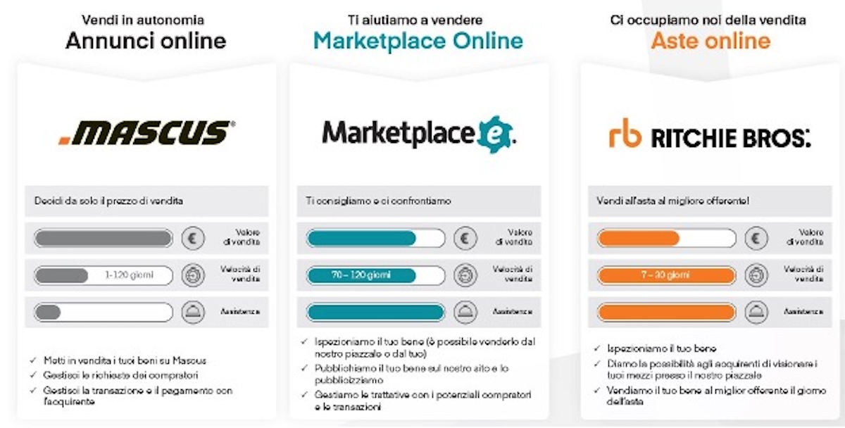 "Proponiamo la piattaforma di annunci Mascus ai venditori che vogliono gestire in autonomia tutte le fasi di vendita, dalla pubblicazione dell'annuncio alla trattativa con il compratore - specifica Scaccaglia. A chi invece desidera il nostro supporto durante la vendita, consigliamo la piattaforma Marketplace- E che permette di controllare maggiormente il prezzo e negoziare le offerte ricevute tramite il team di Marketplace-E Specialist".