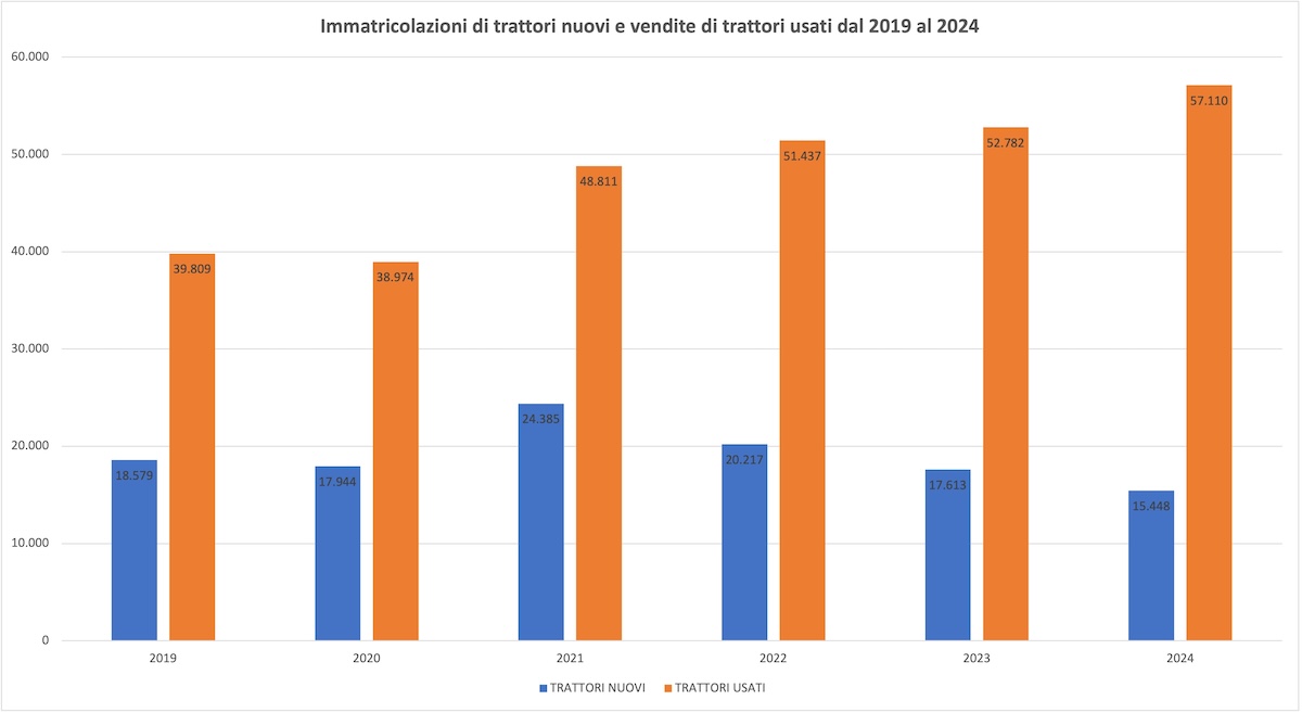 Confronto tra le immatricolazioni di trattori nuovi e le vendite di trattori usati dal 2019 al 2024