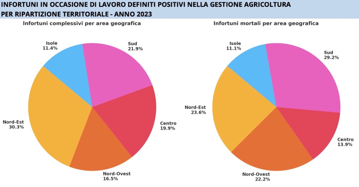La distribuzione territoriale degli infortuni in agricoltura nel 2023 mostra un quadro disomogeneo. Se il Nord registra il numero più alto di incidenti complessivi, 46,8% in totale così suddivisi, 30,3% al Nord-Est e 16,5% al Nord-Ovest, è il Sud a detenere il primato degli infortuni mortali con un’incidenza del 29,2% rispetto al 21,9% sul totale degli infortuni.