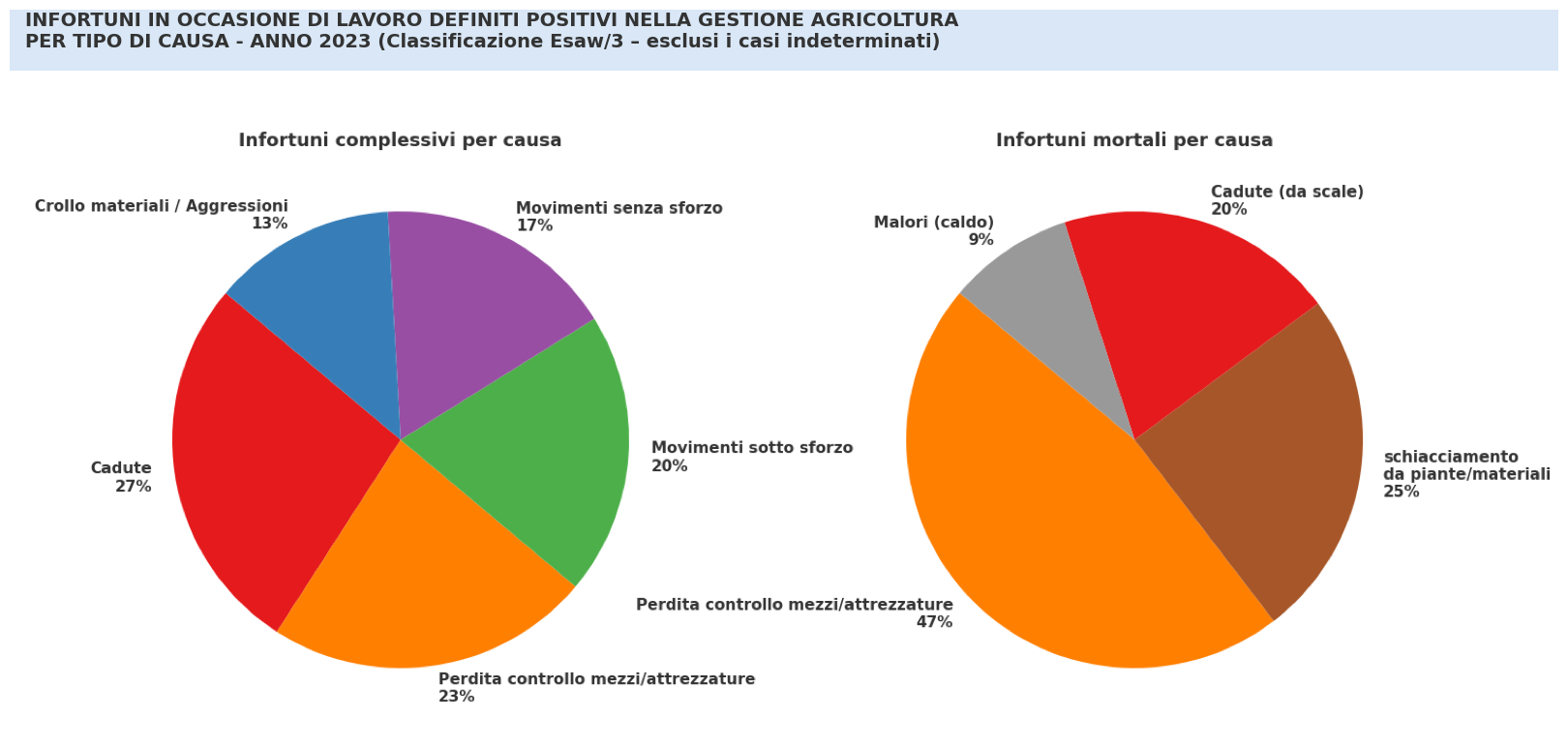 Sempre nel 2023, le principali cause di infortunio in agricoltura sono legate a dinamiche ricorrenti e ben identificate. Secondo la classificazione Esaw/3 effettuata da Inail sui casi definiti positivi, circa un quarto degli infortuni sul lavoro è stato provocato da cadute (27%), seguite a breve distanza dalle perdite di controllo di mezzi, utensili o attrezzature (23%). A queste si aggiungono i movimenti sotto sforzo (20%) e quelli senza sforzo apparente (17%). Mentre episodi come crolli di materiali o aggressioni da animali rappresentano le cause residue.