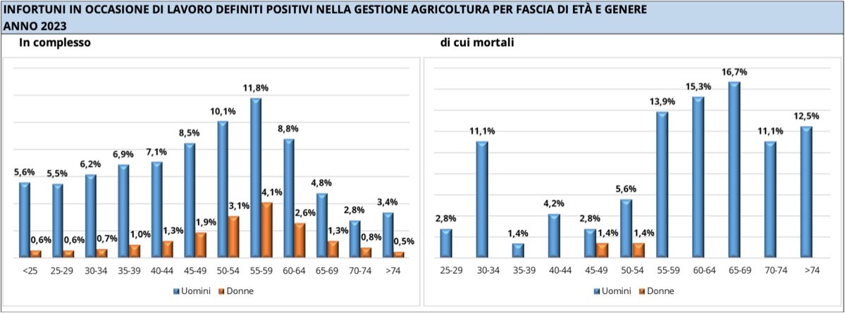 Per quanto riguarda la ripartizione degli infortuni per età, nel 2023 sono stati colpiti soprattutto gli uomini sopra i 50 anni, con un picco nella fascia 55-59 anni (11,8%). La presenza femminile, largamente minoritaria, si concentra nelle fasce centrali di età.