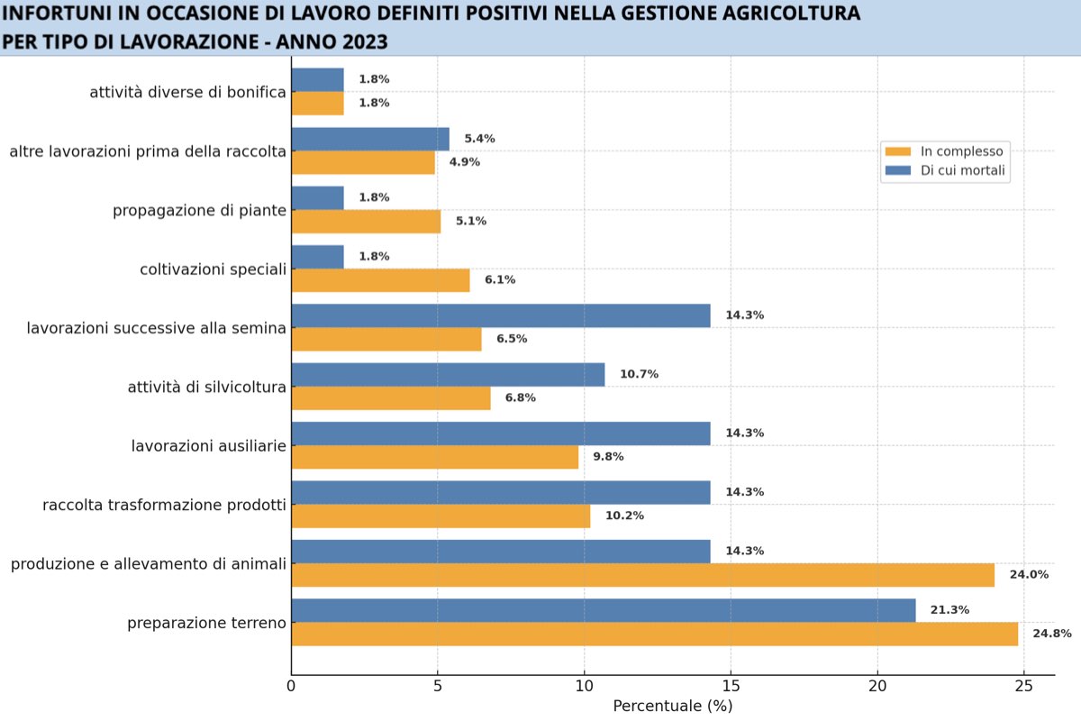 Nel 2023, quasi la metà degli infortuni sul lavoro in agricoltura si è concentrata in due fasi fondamentali del ciclo produttivo: la preparazione del terreno (24,8%) e la produzione e allevamento di animali (24,0%). Tali attività, oltre a essere tra le più diffuse, implicano un elevato uso di mezzi meccanici.