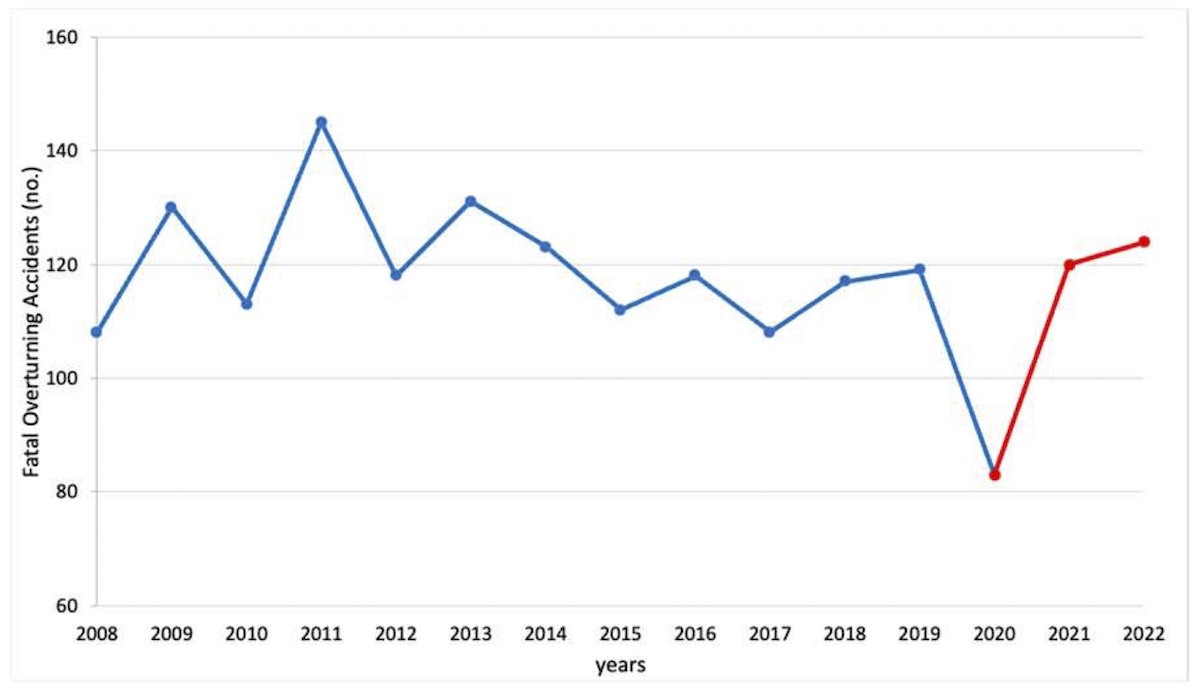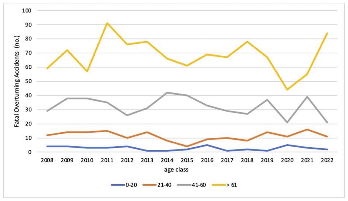 L'andamento delle morti per ribaltamento rilevato dall'Osservatorio - qui l'ultimo articolo pubblicato di recente dal gruppo di ricerca - dipinge una situazione grave che oltretutto non accenna a migliorare.