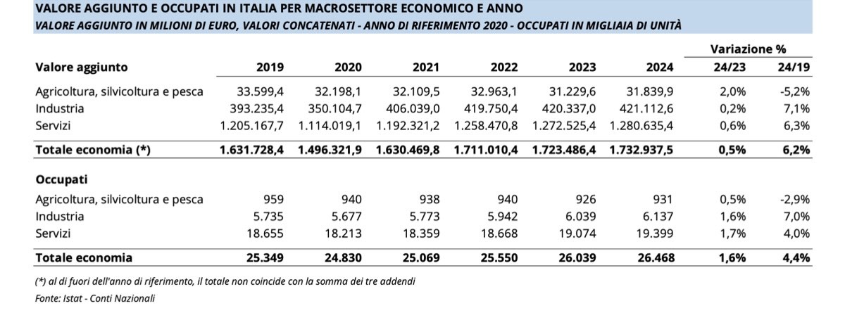 Valore aggiunto e occupati in Italia per macrosettore economico e anno