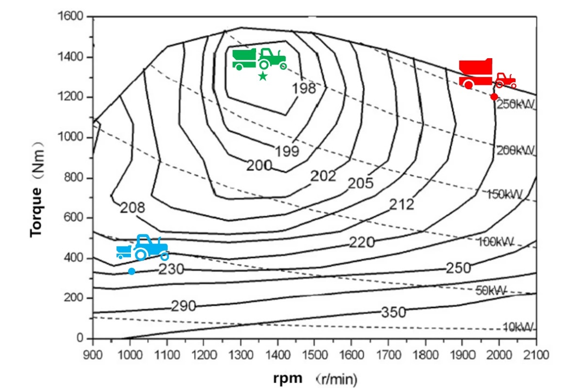 Ad esempio, come visibile nell'immagine successiva, un aratro con 8 vomeri abbinato a un trattore da 100 cavalli richiederebbe di lavorare ad un regime motore eccessivo con un consumo medio elevatissimo (punto rosso). Allo stesso modo, un erpice da 2,5 metri abbinato ad un trattore da oltre 300 cavalli, farebbe lavorare il mezzo ad un regime inferiore a quello ottimale per i consumi (punto blu). Un dimensionamento corretto invece, consente al trattore di collocarsi nell'intorno del punto di minor consumo (stella verde).