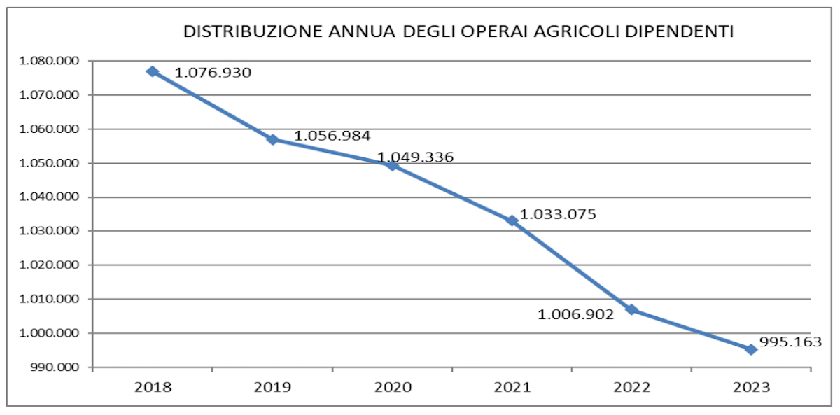 Il numero di operai agricoli dipendenti decresce dal 2018 fino a scendere sotto il milione nel 2023