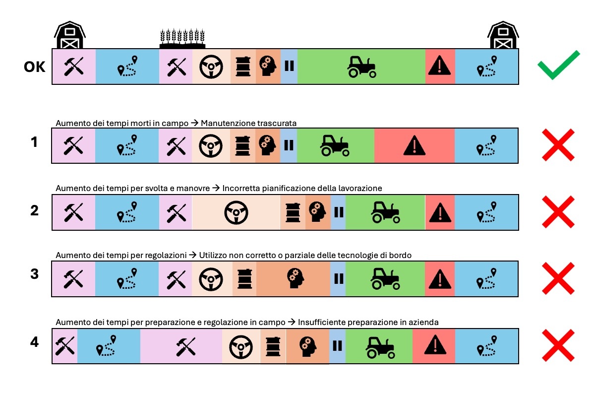 Tempi di lavoro (durate indicative e non in scala) di una generica operazione meccanizzata agricola