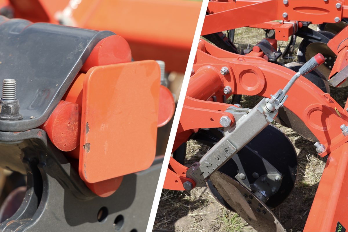 Dettagli del KUHN Cultimer L 500 R: a sinistra i silenziatori in elastomero, a destra manovella di regolazione dell'altezza della dischiera