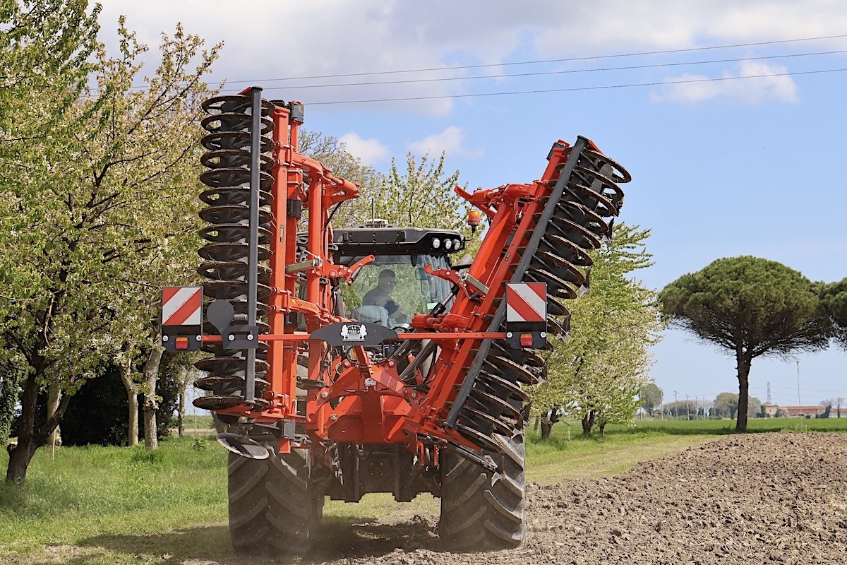 Al lavoro nei campi di Cavarzere abbiamo visto il modello Cultimer L 500 R portato da 5 metri con telaio pieghevole, pensato per l'accoppiamento con trattrici di potenza dai 200 cavalli.