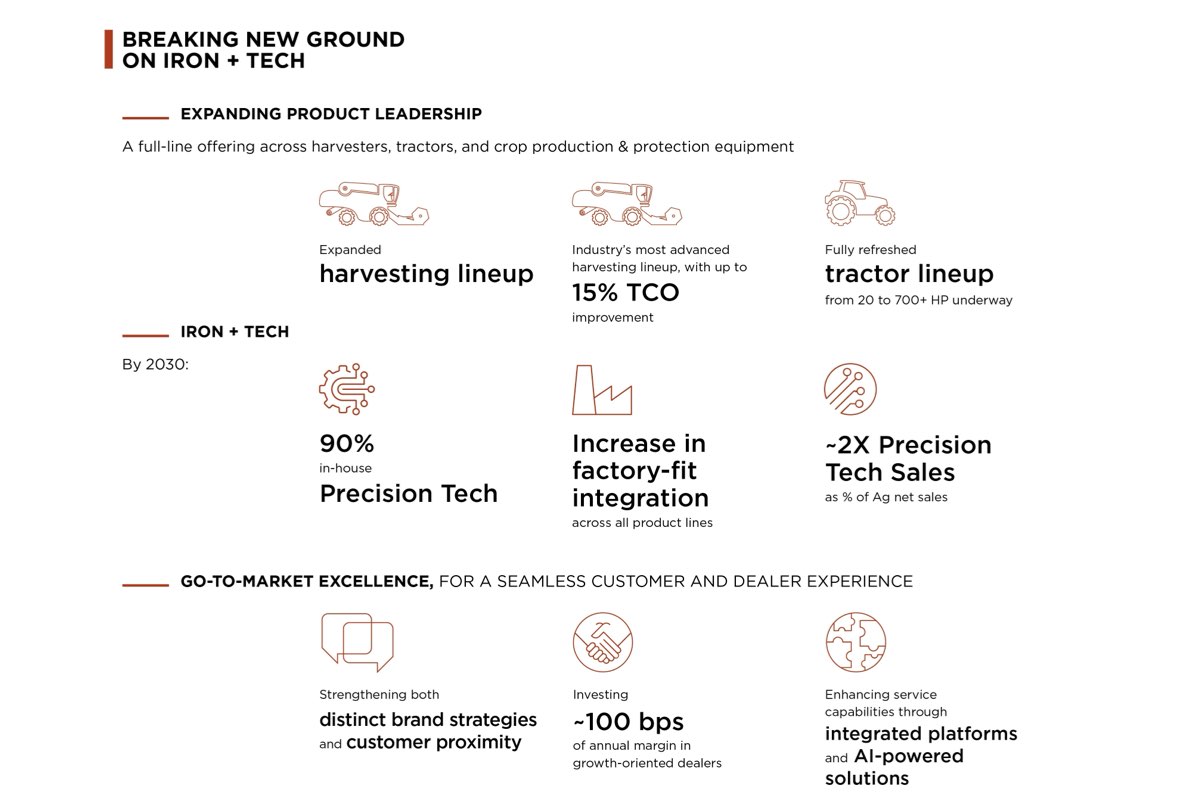 Alla fine del piano strategico, si prevede che il contributo delle vendite derivanti dalla Precision Tech raddoppierà in percentuale rispetto alle vendite nette complessive del settore Agricoltura, contribuendo così ad aumentare i margini.