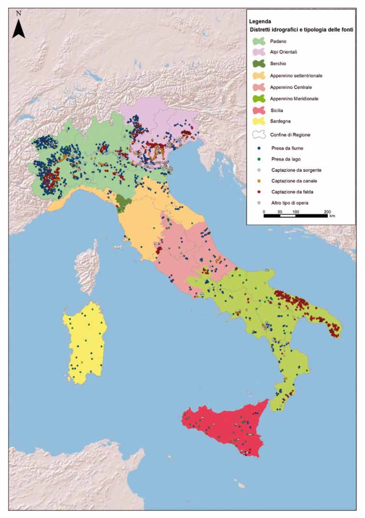 Fonti di approvvigionamento irriguo utilizzate degli Enti irrigui nei distretti idrografici italiani (in rosso i pozzi)