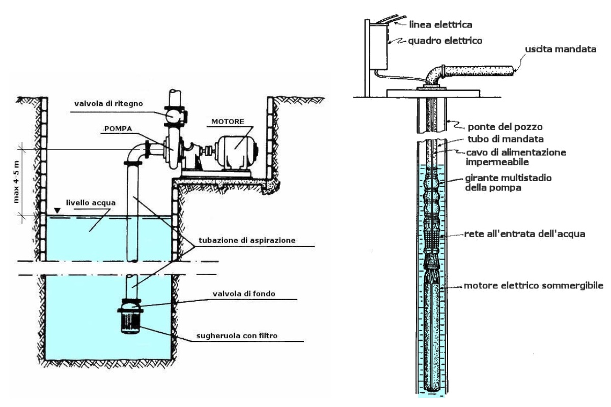 Differenze tra una pompa con motore in superficie ad asse orizzontale (sinistra) e un'elettropompa sommersa (destra)