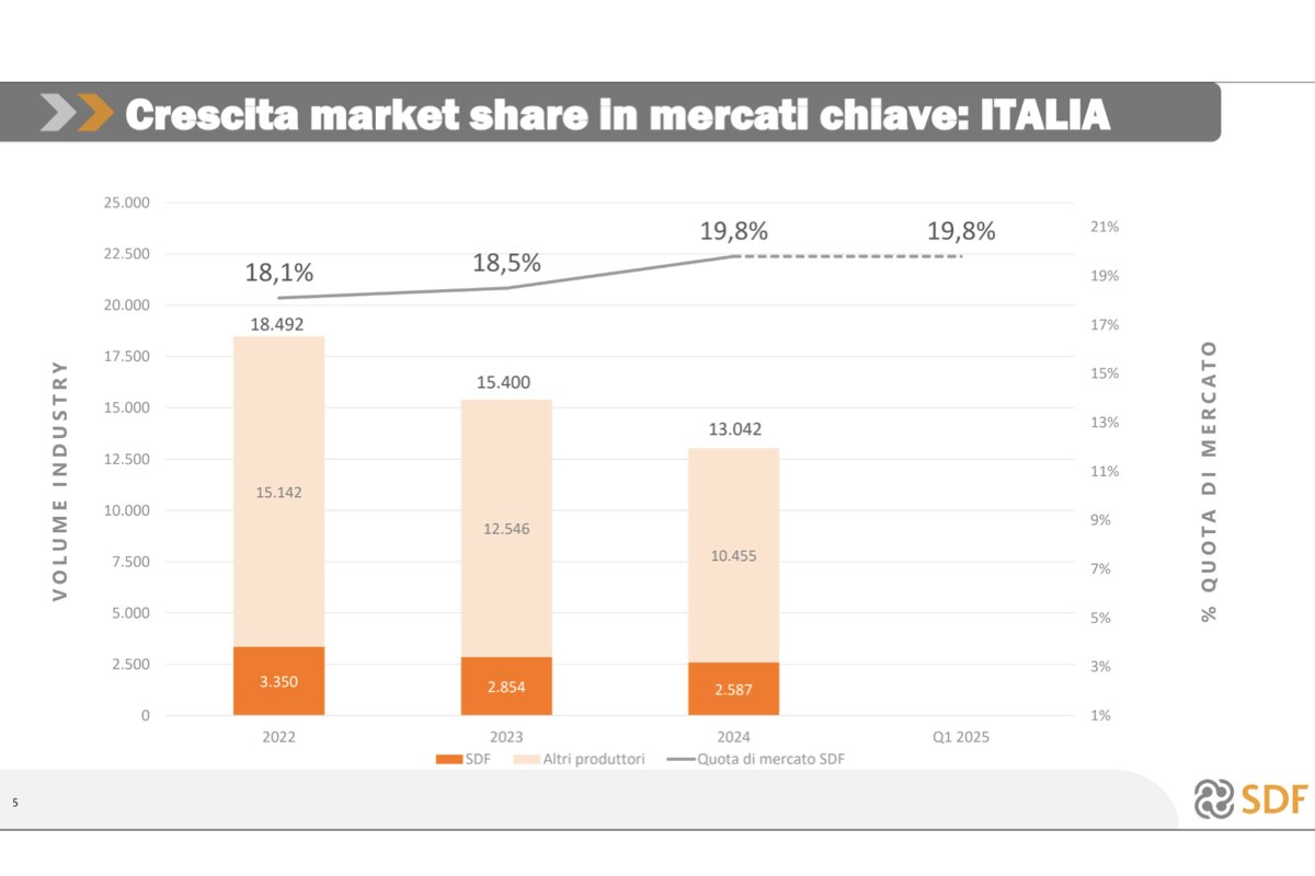 Andando a dettagliare, nel mercato Italia che ha sofferto un calo importantissimo nel 2024, la quota di mercato SDF è salita fino ad un 19,8% e sembra tenere la posizione anche in questa prima fase del 2025.