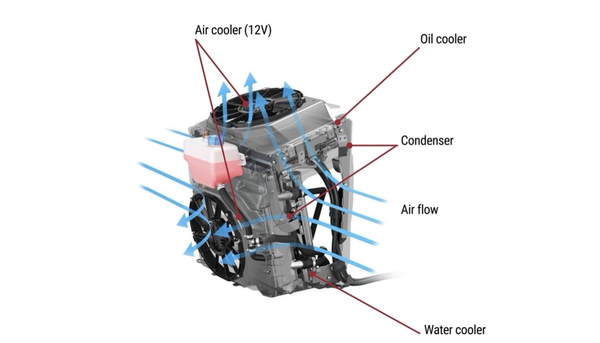Sotto cofano, invece del motore, troviamo un rinnovato sistema di gestione termica composto da due radiatori per la gestione dell'olio e del liquido di raffreddamento, due scambiatori di calore per il climatizzatore e due ventole, tutto azionato elettricamente.