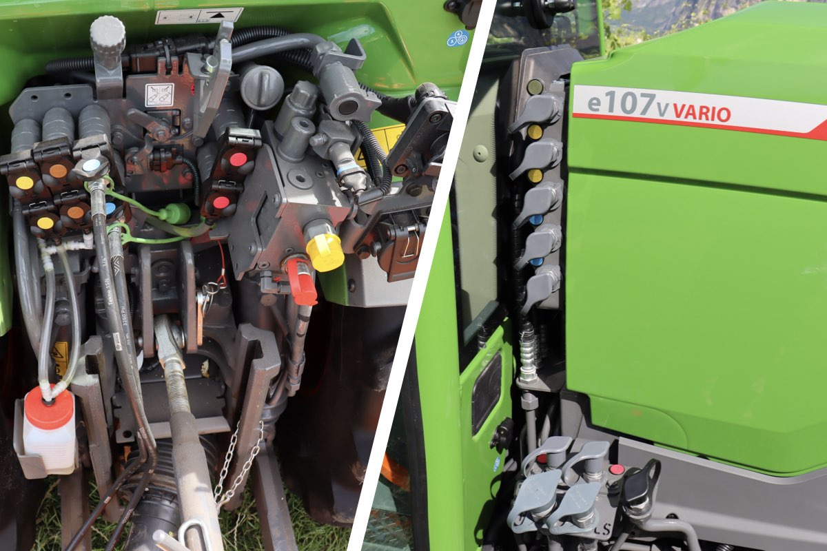 Il Fendt e107 V Vario può essere configurato con un massimo di 6 distributori idraulici: 4 posizionati ventralmente sul lato destro, 2 sul lato sinistro e altri 4 sdoppiati nella parte posteriore. Inoltre è dotato del Power Beyond, "un sistema idraulico aggiuntivo che permette di ricevere olio direttamente dalla pompa a portata variabile riducendo il numero di collegamenti idraulici - spiega Pariani. In questo modo è l'attrezzo a richiedere olio al trattore per azionare funzioni idrauliche automatiche, invece che l'operatore a fornirlo".