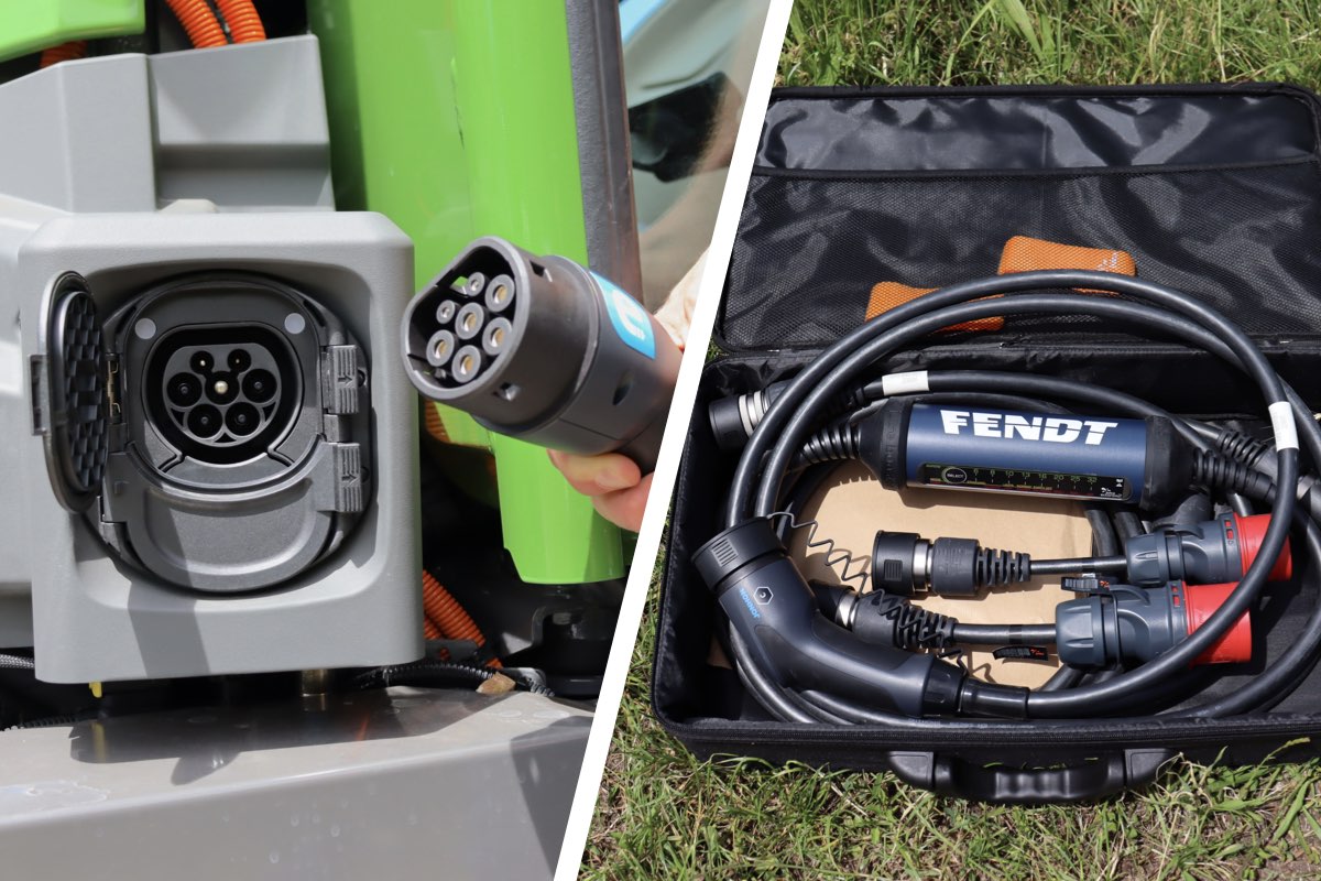A sinistra la presa di corrente di derivazione automotive per la ricarica in corrente alternata del nuovo Fendt e107 V Vario, a destra il kit di ricarica con cavo e adattatori