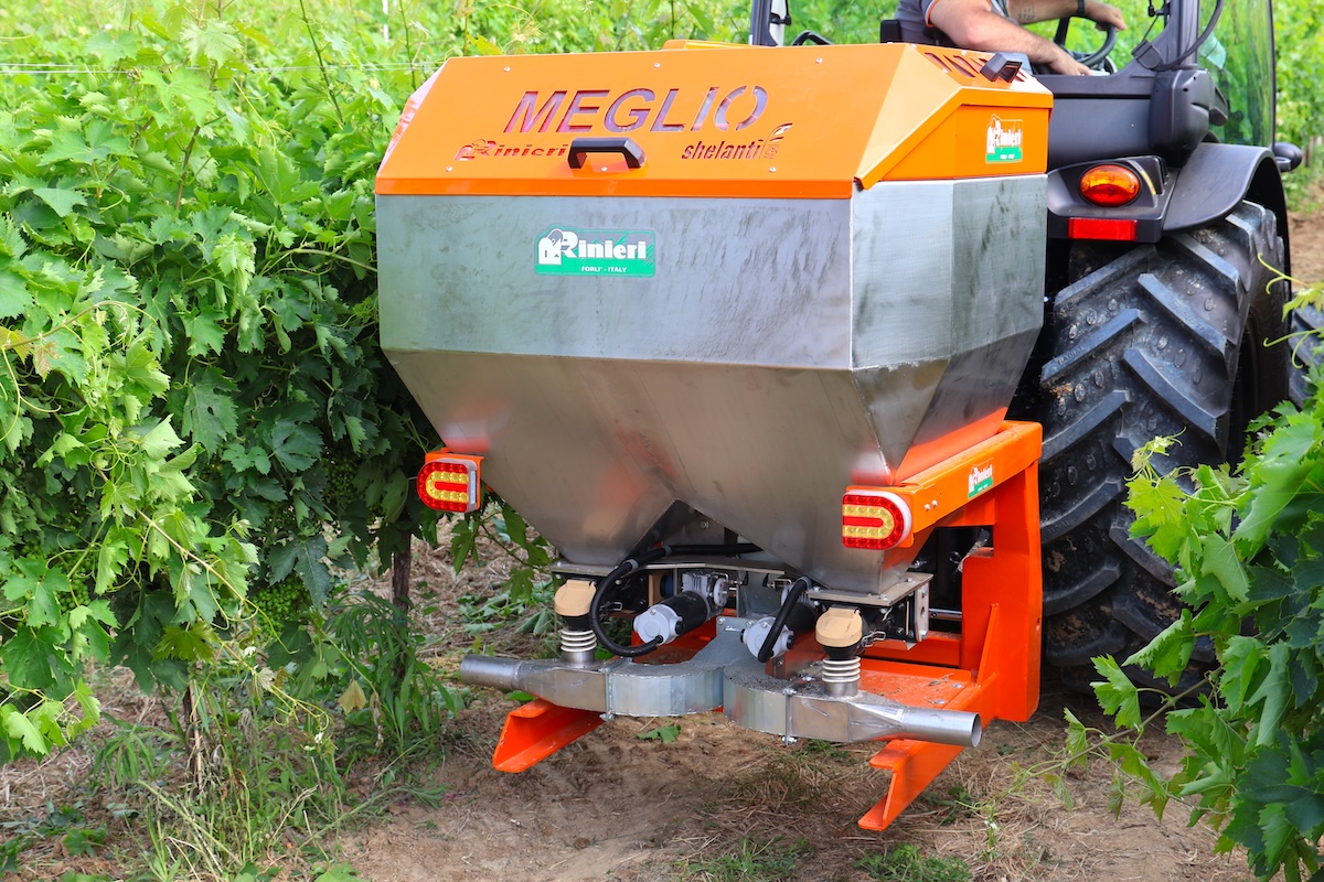 Dopo aver vinto una menzione ad Eima 2024, lo spandiconcime Meglio di Rinieri ha fatto il suo primo ingresso in vigneto tra i filari dell'azienda Marramiero. La novità di Rinieri presenta una tramoggia da 500 litri, dosatori a controllo elettronico, Gps integrato e comando con trasmissione dati Bluetooth.
