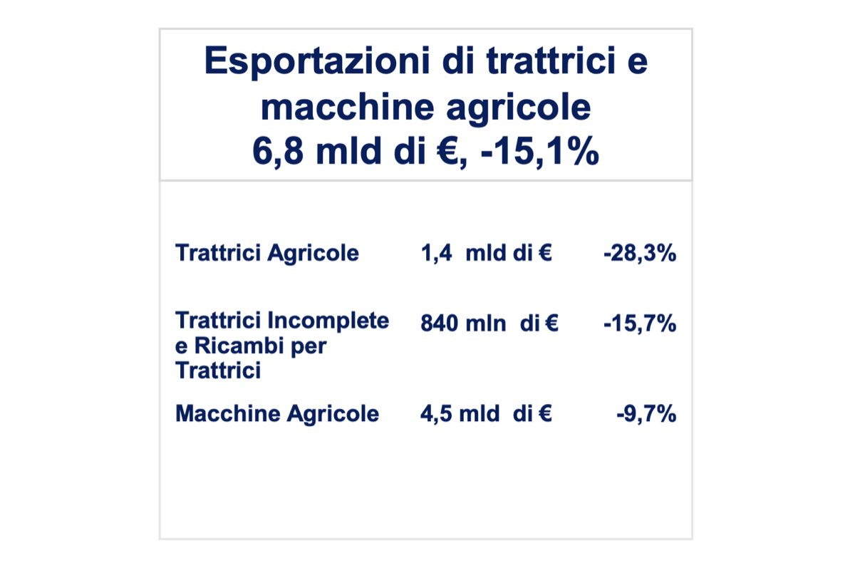 Quasi il 70% del valore complessivo delle esportazioni nazionali deriva dall'export di macchine agricole (4,5 miliardi, -9,7% rispetto al 2023), seguito dall'export di trattrici (1,4 miliardi, -28%) e di trattori incompleti e ricambi (840 milioni, -15,7%). Nonostante la flessione, l'Italia mantiene il quarto posto nella classifica 2024 dei principali esportatori di trattrici e macchine agricole.