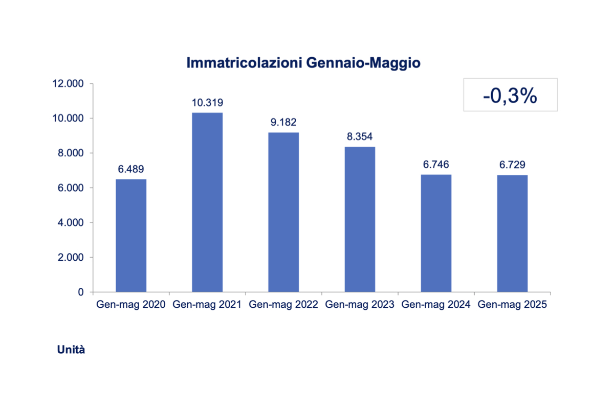 Immatricolazioni di trattrici in Italia da gennaio a maggio 2025 a confronto con gli ultimi 5 anni