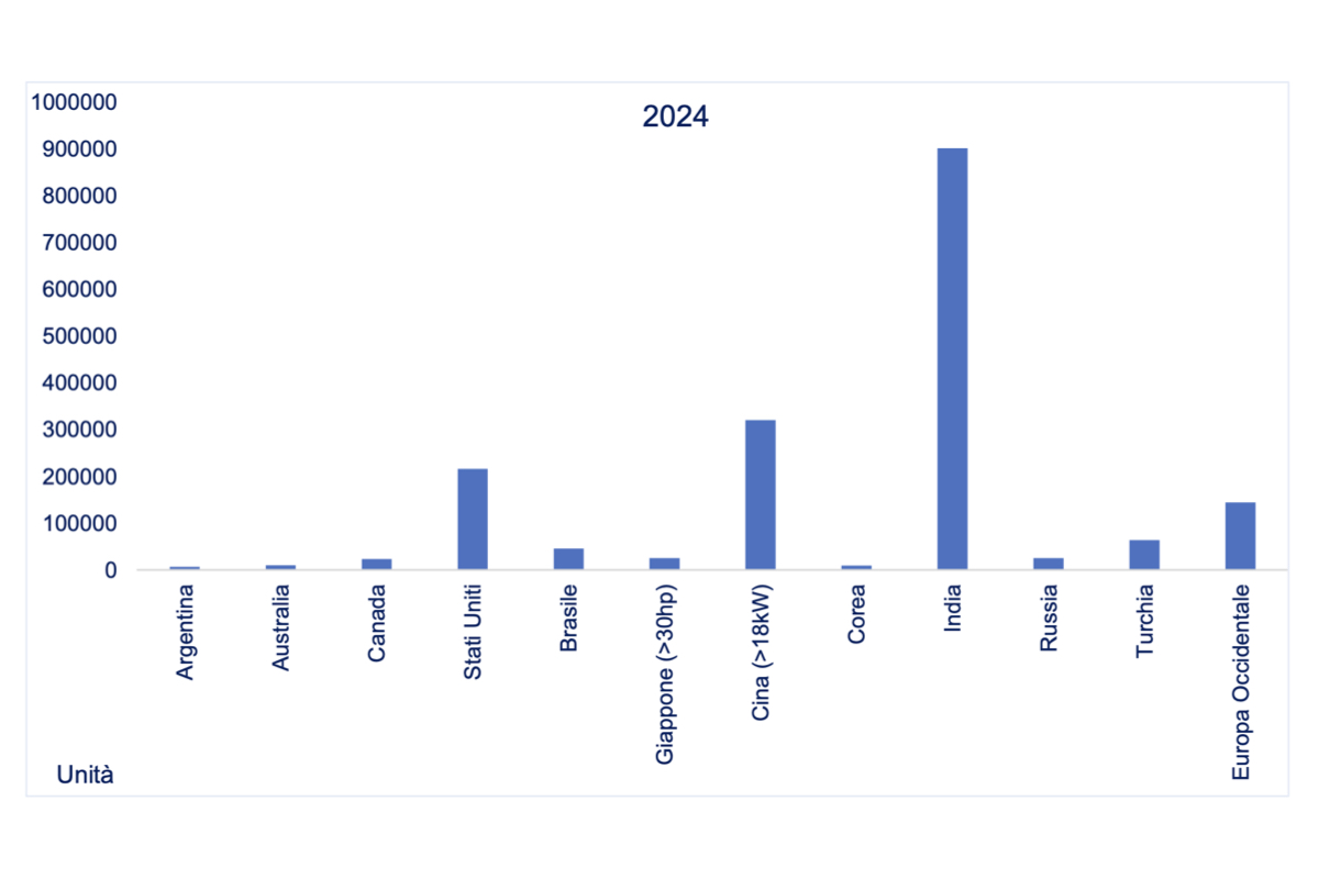 In questo scenario si distingue l'India che, pur presentando immatricolazioni in calo del 2%, non si discosta sostanzialmente dai valori del 2023 e si conferma per il quarto anno consecutivo un mercato con oltre 900mila trattrici immatricolate.