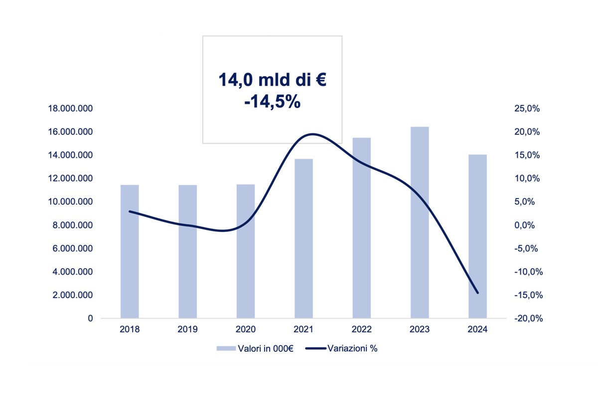 Nel 2024 la bilancia commerciale del settore ha presentato comunque un saldo attivo, pari a 4,9 miliardi di euro, ma ha mostrato un peggioramento che permane nel 2025 a causa delle tensioni e delle restrizioni nel commercio internazionale.