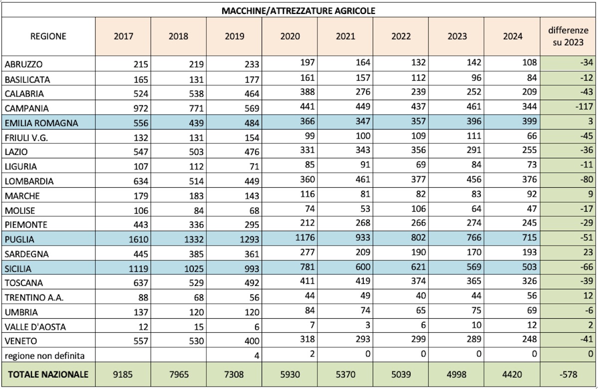Furti denunciati di macchine e attrezzature agricole in Italia dal 2017 al 2024
