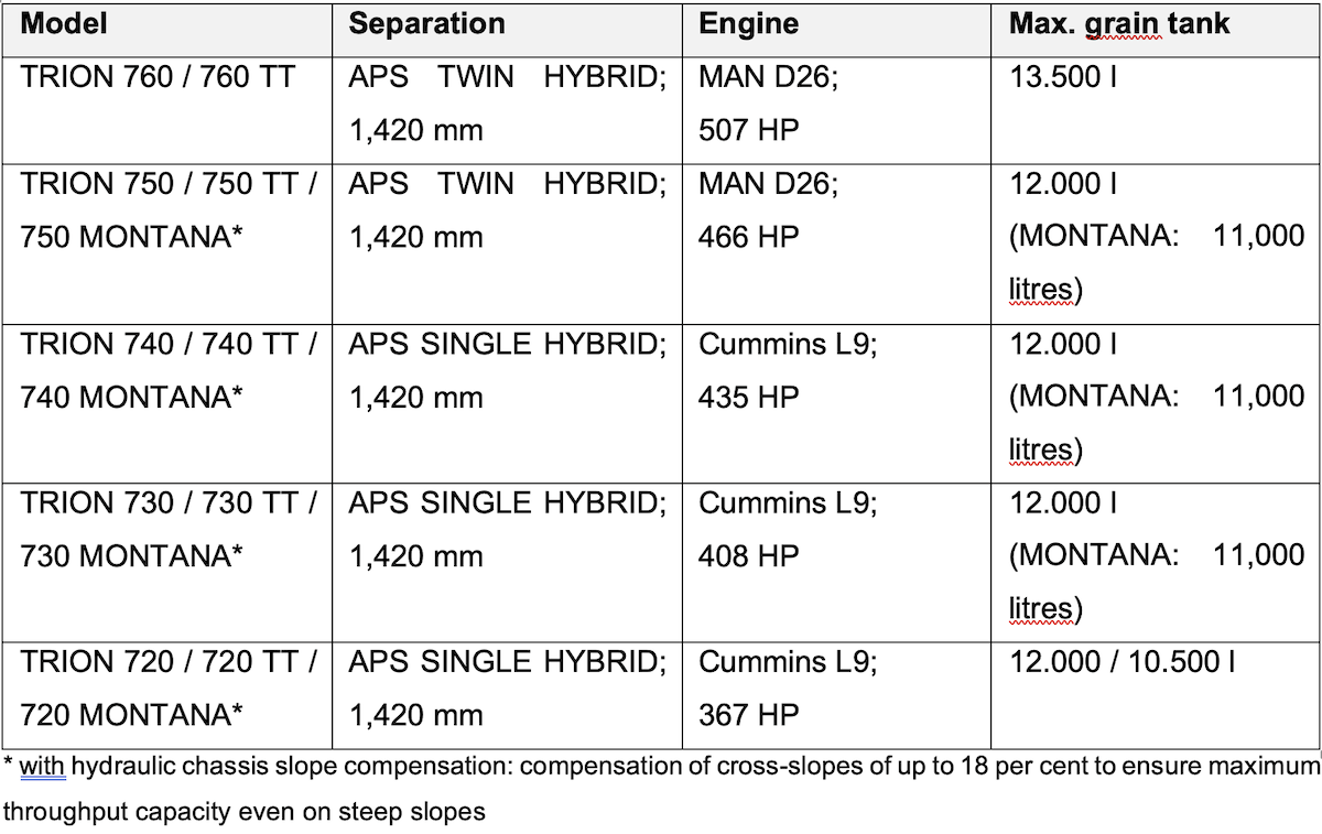 La gamma - composta da Trion 500, 600 e 700 - permette di scegliere tra versioni a 5 o 6 scuotipaglia, sistemi ibridi APS Hybrid, e opzioni su ruote, con cingoli Terra Trac o assetto Montana. A partire dal 2026 sarà disponibile il nuovo modello che si va a posizionare al top della categoria: la Trion 760.