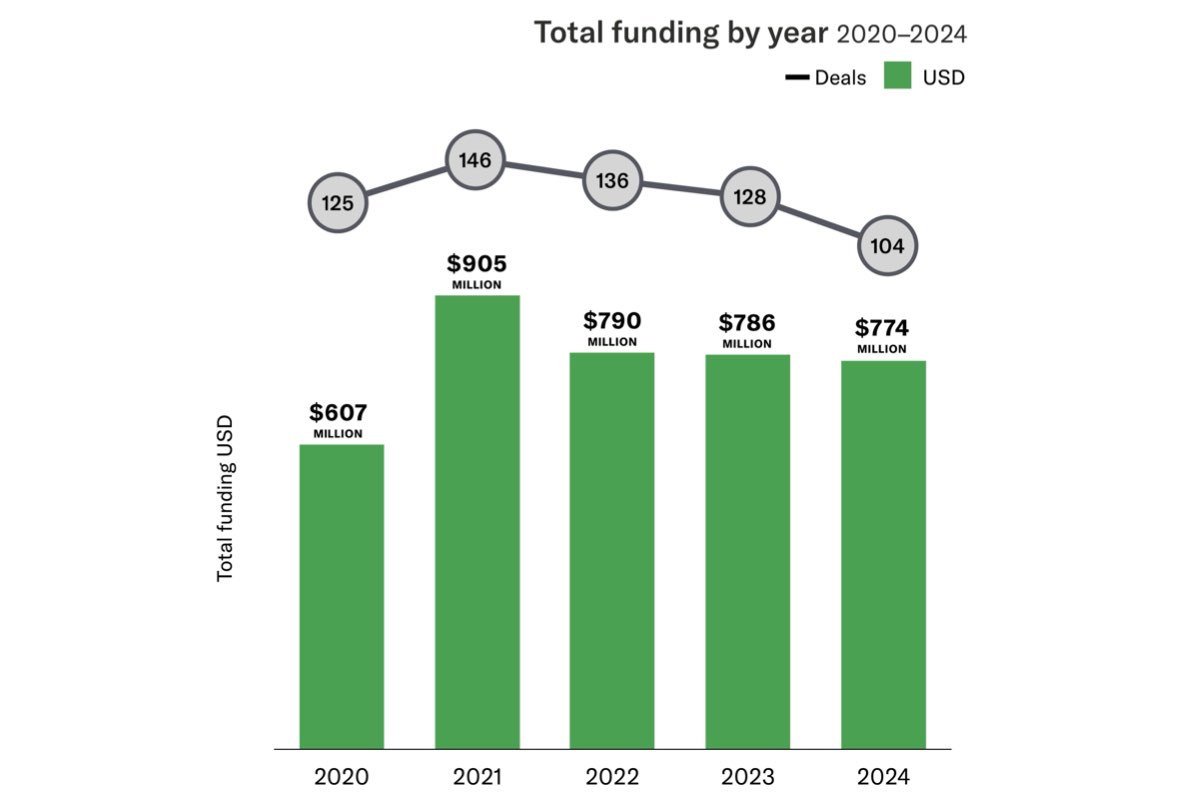 Negli anni successivi, si osserva una fase di apparente stabilità accompagnata da un lieve calo, ma su livelli nettamente superiori al 2020. L'ammontare dei finanziamenti rimane simile, mentre diminuisce il numero di accordi stipulati. Se nel 2022 i 136 accordi hanno totalizzato 790 milioni di dollari, nel 2024 sono solo 104 quelli stipulati, a fronte di un totale di 774 milioni.