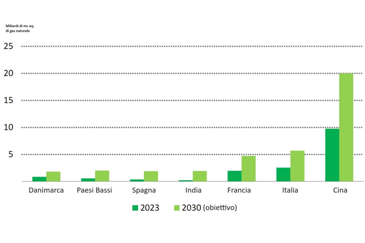 - Definire obiettivi: ad esempio, l'Unione Europea ha fissato un obiettivo non vincolante di 35 miliardi di metri cubi di biometano entro il 2030 nel suo Piano REPowerEU del 2022 come via per ridurre la dipendenza dal gas proveniente dalla Federazione Russa dopo l'invasione dell'Ucraina. Curiosamente, l'Italia è il secondo Paese dopo la Cina per ambiziosità degli obiettivi nazionali (Foto 2), nonostante il Governo attuale non stia facendo granché per promuovere il biometano e i Governi precedenti fossero dichiaratamente ostili.