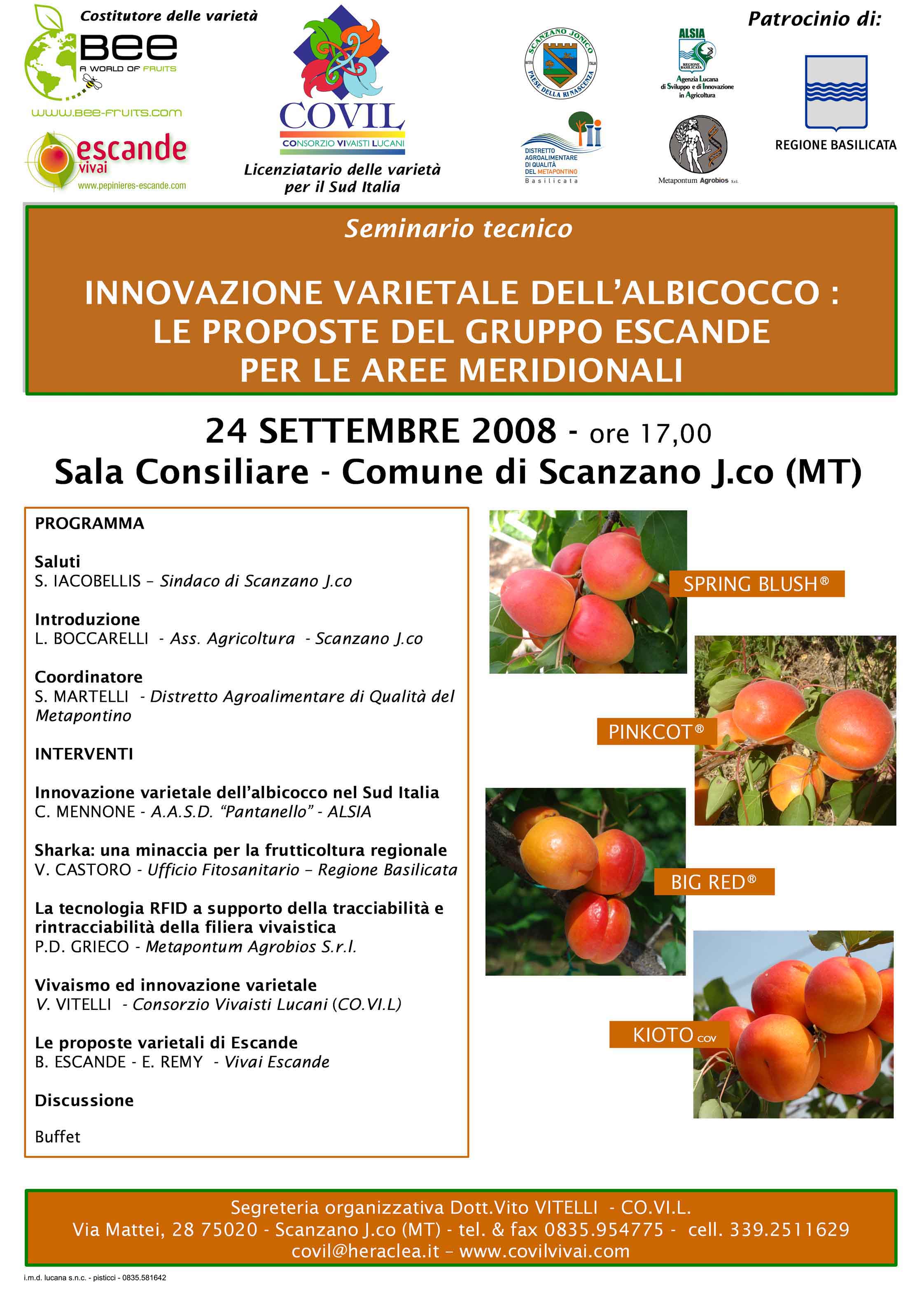 Il 24 settembre 2008 a Scanzano Jonico (Mt) si è svolto il seminario tecnico "Innovazione varietale dell'albicocco: le proposte del gruppo Escande per le aree meridionali", organizzato da Covil (Consorzio Vivaisti Lucani).